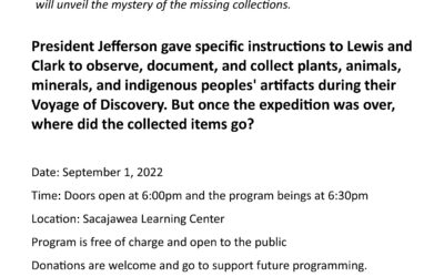 Join us Thursday, September 1 at the Sacajawea Learning Center for "The Collections of Lewis and Clark: What Happened to All That Stuff" by Kathy Imel, the resident volunteer at the Sacajawea Center. Doors open at 6:00pm and the program starts at 6:30pm. The program...