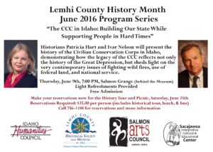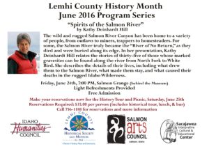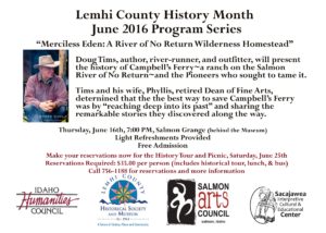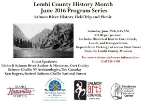 The Sacajawea Center, Lemhi County Historical Society and Museum, and the Salmon Arts Council bring you three guest speakers and a field trip to celebrate Lemhi County History Month this June. This year we explore how the Salmon River has shaped the people who have lived along side it, and how people have interacted with the river over the decades. We’ll finish out the month with a day-long field trip and luncheon downriver. Details are below. Please call with any questions or to reserve your space on the field trip (756-1188).