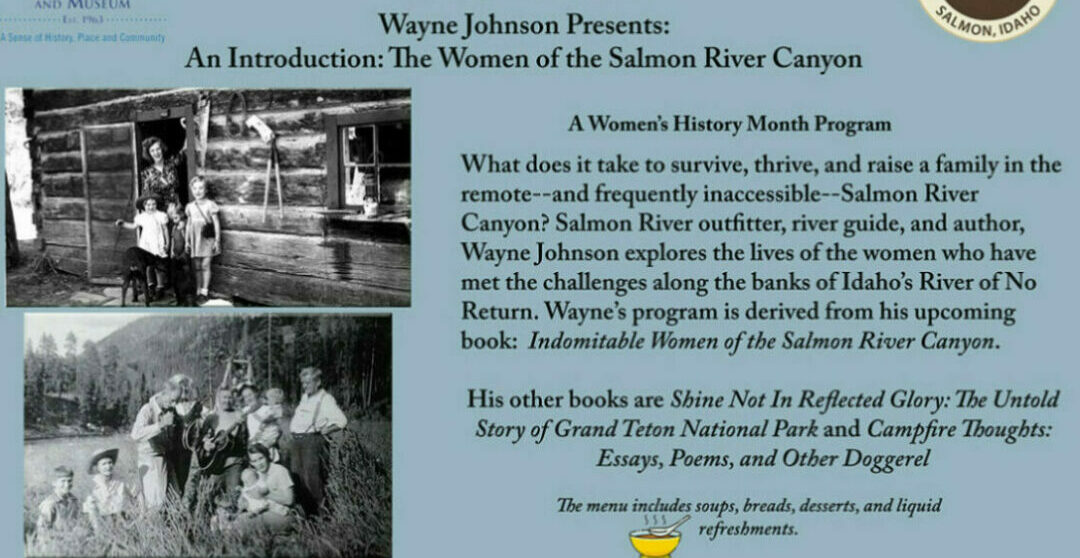A Women’s History Month Program with lunch: What does it take to survive, thrive, and raise a family in the remote–and frequently inaccessible–Salmon River Canyon. Salmon River outfitter, river guide, and author, Wayne Johnson explores the lives of the women who met the challenges along the banks of Idaho’s River of No Return. Wayne’s program is derived from his upcoming book: “Indomitable Women of the Salmon River Canyon.”