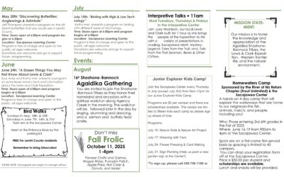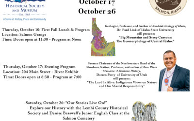 Please join the Sacajawea Center and Lemhi County Historical Society for a series of exciting events this October! October 10: First Fall Lunch and Program by Dr. Paul Link "Big Mountains and Steep Canyons: The Geomorphology of Central Idaho." Location: Salmon Grange...