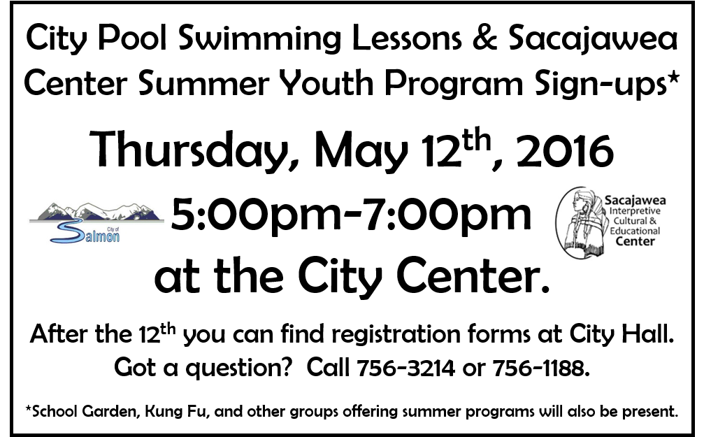 On Thursday, May 12 from 5:00 to 7:00 pm the Sacajawea Center will be set up at City Hall for program sign-ups. If you cannot make it that evening you can drop your registration form and payment off at the Sacajawea Center or City Hall beginning Friday, May 13th. You...